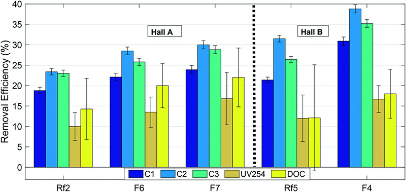 圖2:改造后的(F6,F(xiàn)7和F4)和參考(Rf2和Rf5)過濾器中活性炭對有機(jī)物級分的去除效率。誤差棒表示通過誤差傳播計算的標(biāo)準(zhǔn)誤差(N=4)。