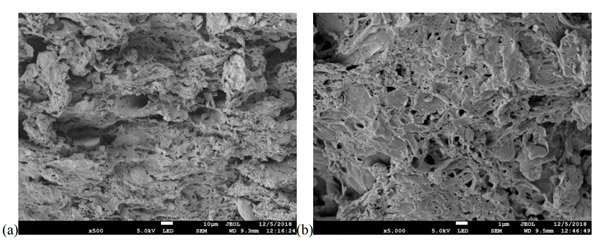 根據(jù)觀察到的活性炭微觀結(jié)構(gòu)來進(jìn)行形態(tài)研究。圖1顯示了在650°C(a)和850°C(b)兩種不同溫度下用25%H3PO4制成的活性炭的比較?梢钥闯,與650℃相比,在850℃下制備的活性炭具有稍大的孔。可以得知孔體積隨著活化溫度的升高而逐漸增加。