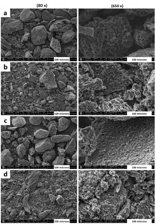 我們使用現(xiàn)代分析技術(shù)來了解制備的活性炭催化劑的真實性質(zhì),掃描電子顯微鏡(SEM)是查看材料形態(tài)的強大工具。圖1顯示了四種活性炭樣品的SEM圖像。圖像是在兩個不同的分辨率,以比較不同比例的樣本。評估不同煅燒溫度的影響是很重要的。圖1的左側(cè)圖像顯示,無論煅燒溫度如何,所有樣品的表面都被各種亞微米大小的顆粒所掩蓋,并且表面上存在許多明顯的解理。不同煅燒溫度下的熱解對活性炭樣品的形貌影響不大,但有輕微的變化,如一些顆粒從表面被去除,一些解理被侵蝕。此外,從這些SEM圖像可以推斷,這些活性炭材料中的許多微孔結(jié)構(gòu)使其成為任何化學反應中反應物相互作用的極好載體。