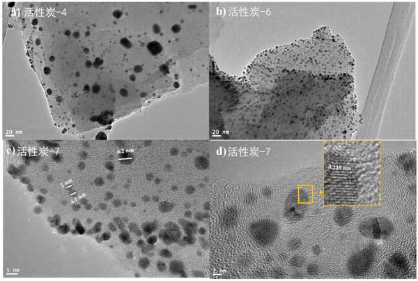 為了進一步研究金顆粒在活性炭表面的分布和結(jié)晶度,我們拍攝了鍍金活性炭樣品的透射電子顯微鏡圖像。圖7顯示了各種活性炭樣品在不同放大倍數(shù)下的TEM圖像。圖2a、b顯示了金納米粒子在活性炭表面上的分布。很明顯,兩個樣本的分布是均勻的;钚蕴-4和活性炭-6似乎都以類似的方式相互作用和承載金納米粒子;钚蕴-7樣品的高分辨率TEM圖像如圖2c、d所示。圖2c顯示大多數(shù)金納米顆粒很小,直徑為3-5nm,并且只能看到少數(shù)團聚顆粒。圖2d顯示了金的晶格條紋間距。發(fā)現(xiàn)晶格條紋間距為0.217nm,對應于金晶面的面。此外,我們試圖通過TEM圖像估計顆粒尺寸的分布,我們發(fā)現(xiàn)所有樣品中超過80%的金顆粒的尺寸小于5nm。