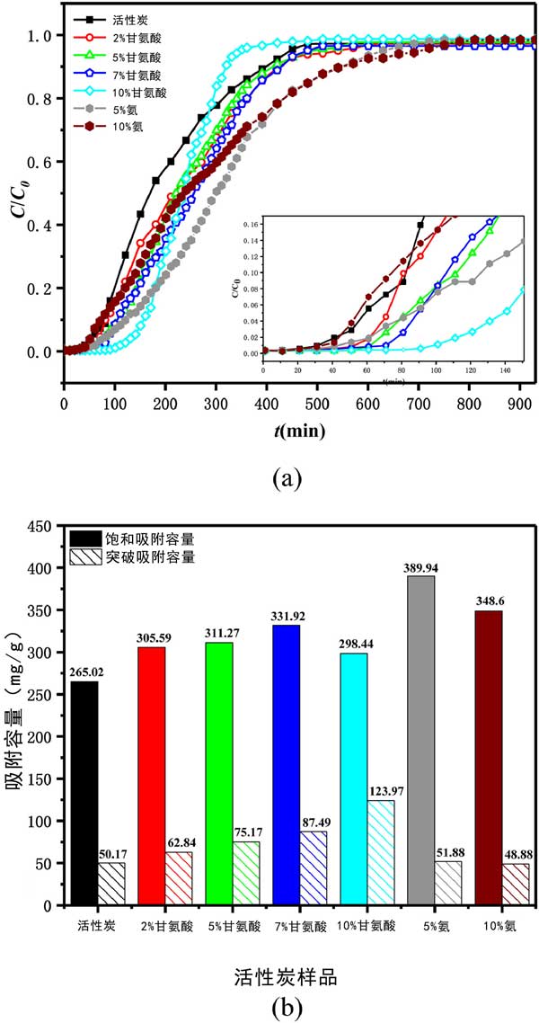 測(cè)試了選定的甲苯VOC對(duì)活性炭的吸附性能。在每個(gè)實(shí)驗(yàn)運(yùn)行中,甲苯通過(guò)裝有活性炭的吸附管直到達(dá)到平衡,即活性炭吸附劑被甲苯飽和。圖2(a)所示的穿透曲線呈現(xiàn)為甲苯吸附量吸附(ç/ç0)與接觸時(shí)間(噸,分鐘)六種的活性炭正在進(jìn)行中,它們的飽和和突破吸附容量如圖2所示(b)。從吸附曲線可以看出,甘氨酸修飾的活性炭的穿透時(shí)間明顯延長(zhǎng),而飽和氨改性活性炭的時(shí)間延長(zhǎng);钚蕴可霞妆酱┩肝侥芰Φ捻樞?yàn)?0%甘氨酸改性活性炭>7%>5%>2%>5%氨改性活性炭>未改性活性炭>10%氨改性活性炭,而活性炭對(duì)甲苯飽和吸附容量的順序如下:5%氨改性>10%>7%甘氨酸改性>5%>2%>10%>未改性活性炭?梢(jiàn)甘氨酸修飾對(duì)甲苯吸附有顯著的正向影響。與原來(lái)的AC相比,甘氨酸改性的活性炭對(duì)甲苯的突破吸附能力分別提高了25%、50%、74%和147%,隨著甘氨酸濃度的增加呈上升趨勢(shì)。同時(shí),甘氨酸改性的活性炭對(duì)甲苯的飽和吸附容量分別增加了15%、17%、25%和13%,且隨著甘氨酸濃度的增加先增加后減少。5%和10%的氨改性也提高了甲苯的吸附性能,但其優(yōu)勢(shì)主要體現(xiàn)在飽和吸附容量上,與原來(lái)的活性炭相比,分別提高了47%和32%。