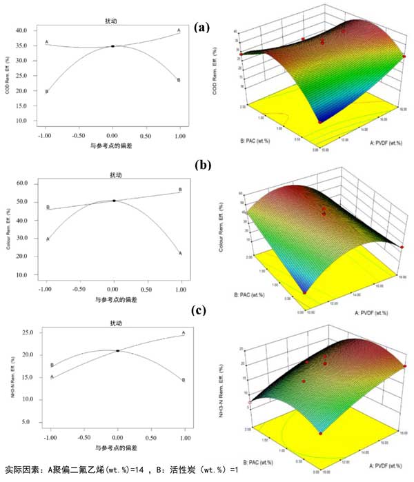 圖3:活性炭與聚偏二氟乙烯制造的膜的擾動(dòng)圖(左)和3D響應(yīng)面(右)用于去除(a)COD、(b)顏色和(c)NH3-N的效率。