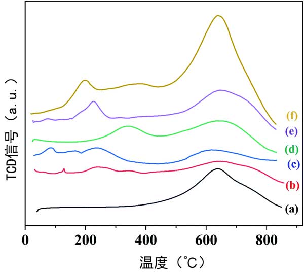 活性炭和載鉑活性炭催化劑的H2-TPR曲線在圖1顯示,它描繪了還原機制。如圖1a所示,在活性炭的H2-TPR曲線中觀察到630℃的峰,這歸因于活性炭的表面官能團。與活性炭相比,活性炭載鉑催化劑的H2-TPR曲線(圖1b)顯示了在240℃和340℃處的峰值,這是由Pt-O-Pt和Pt-O-C的還原產(chǎn)生的,分別進一步證明了活性炭載鉑催化劑的成功合成。在硫酸活化活性炭(圖1c)、氨基丙基三乙氧基硅烷活化(圖1d)的H2-TPR曲線中也觀察到了Pt-O-Pt或Pt-O-C的還原峰)、氧化氫活化(圖1e)和硝酸活化(圖1f),它們可以改善金屬物種的分散。此外,活性炭載鉑基催化劑曲線中的還原峰小于400℃,這表明鉑在甲基環(huán)己烷脫氫之前催化劑中處于金屬狀態(tài)。