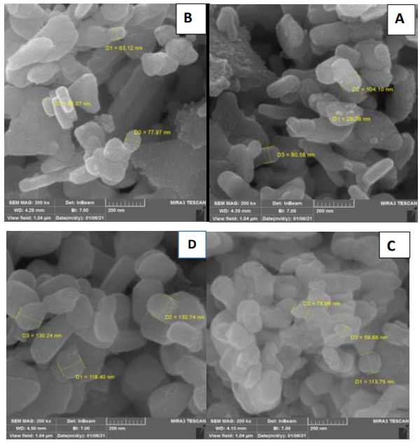 未活化的活性炭與物理活化的活性炭復合材料的合成使用水熱法制備了。根據(jù)該方法,金屬化氧化鐵銅納米粒子懸浮在30mL燒杯中,直接加入活性炭懸浮液,超聲處理30分鐘。然后將這兩種懸浮液在一個燒瓶中混合,在80℃下連續(xù)攪拌,直到溶劑完全蒸發(fā)。此時,收集所得固體并在100℃下干燥12小時獲得活性炭復合材料。利用掃描電鏡對合成的這幾種活性炭材料的表面形貌進行了研究。純氧化鐵銅納米粒子的表面形態(tài)如圖1A所示,它顯示了中等均勻的球形顆粒,粒徑約為31nm。活性炭復合材料的圖像如圖1C所示,該圖像顯示了較小的均勻性,粒徑相對較大,并且存在顆粒團聚。這很可能是由于復合材料中存在活化后的活性炭,這可以增強表面協(xié)同效應,促使顆粒尺寸增加,因為在這些條件下晶體生長。復合材料氮鐵銅的圖像如圖1D所示,從該圖像可以看出,存在相對均勻的分布,球形顆粒幾乎與氧化鐵銅相似,但氧化鐵銅氮的粒徑相對大于氧化鐵銅。這可能是由于摻雜氮物種后晶體生長所致。