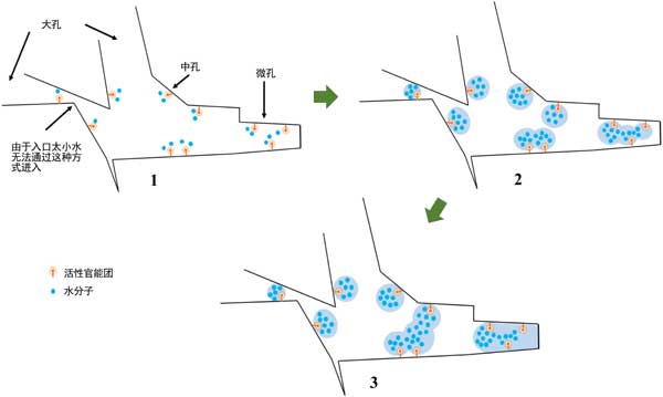 不同碳化溫度制備的活性炭1、2具有相似的吸附形狀,水的吸附形狀、吸收和滯后受表面官能團、孔徑、孔體積和孔連通性的強烈影響。為了解釋這一點,圖3說明了活性炭吸附水的理論機制。并非所有官能團對水分子都具有相同的親和力。但是羧基可以有很好吸引水分子。這次制造的活性炭具有羧基官能團,然后理論上作為水附著在活性炭表面的初始位點(圖3-1)。隨著更多的水被吸附,水-水開始通過氫鍵相互作用,然后形成簇(圖3-2)。如果每個官能團之間的距離足夠近,在合適的孔徑和大量或可接近的活性官能團,每個相鄰的水團可以合并并填充微孔(圖3-3);钚蕴康倪@種吸附能力的提高主要是由于在溫和條件下經(jīng)過空氣處理后含氧表面官能團的增加和活性炭的孔隙發(fā)展引起的。