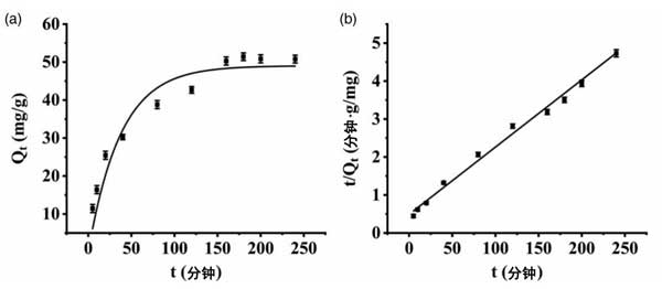 圖3:(a,b)改性活性炭的擬一級(jí)動(dòng)力學(xué)吸附曲線和擬二級(jí)動(dòng)力學(xué)吸附曲線。