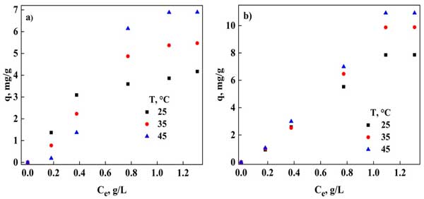 平衡吸附分析使我們能夠獲得不同等溫線模型的參數(shù),表明在去除污染物時(shí)進(jìn)行了何種類(lèi)型的過(guò)程。在圖1中,顯示了使用粉末活性炭(圖1a)和活性炭(圖1b)在不同溫度下DNS的吸附能力。還觀察到3,5-二硝基水楊酸在兩種吸附劑中的吸附都隨著溫度的升高而顯著影響,隨著溫度的升高呈現(xiàn)出更大的吸附。因此,在45℃時(shí),活性炭和粉末活性炭的大吸附容量分別為6.97和11.57mg/g。這可能是由于去除過(guò)程的環(huán)境,這會(huì)導(dǎo)致吸附劑表面隨著溫度的升高而增加其對(duì)3,5-二硝基水楊酸吸附的參與。使用商用活性炭的文獻(xiàn)中也報(bào)道了類(lèi)似的行為。在其他研究中,使用這種吸附劑還觀察到,基于苯酚、高氯酸鹽和重金屬等的不同化合物的吸附能力有所增加。