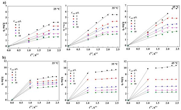 圖2:不同溫度下的外部傳質(zhì)分析(a)活性炭和(b)粉末活性炭。