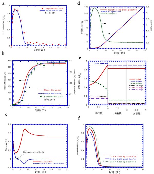 圖3:實(shí)驗(yàn)結(jié)果和模型模擬(a)COD流出物,(b)生物質(zhì)生長(zhǎng),(c)流入生物膜和活性炭的通量,(d)COD去除,(e)COD曲線,和(f)COD流出物各種有機(jī)負(fù)載率(OLR)。