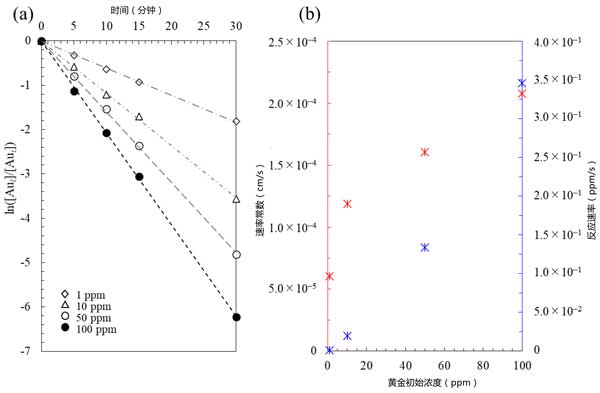 圖1:(a)初始金濃度對(duì)金離子回收率的影響,和(b)通過(guò)鋁和活性炭在銨中的電流相互作用進(jìn)行的膠合反應(yīng)的速率常數(shù)/反應(yīng)速率與初始金濃度的關(guān)系圖硫代硫酸鹽體系(注意反應(yīng)速率為負(fù)值)。