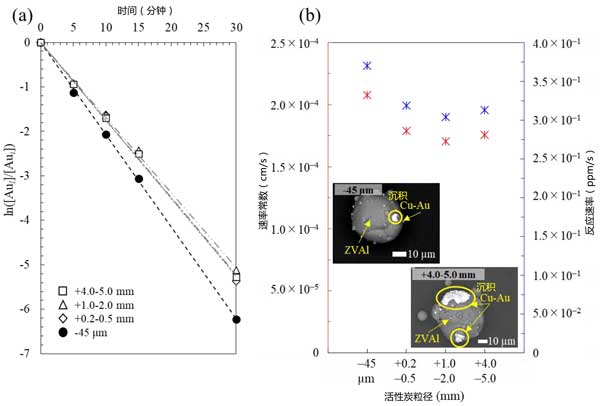 圖2:(a)活性炭尺寸對(duì)金離子回收率的影響,以及(b)鋁和活性炭在硫代硫酸銨體系中通過(guò)電偶相互作用進(jìn)行的膠合反應(yīng)的速率常數(shù)/速率與活性炭尺寸的關(guān)系圖(注意,反應(yīng)速率為負(fù)值)。
