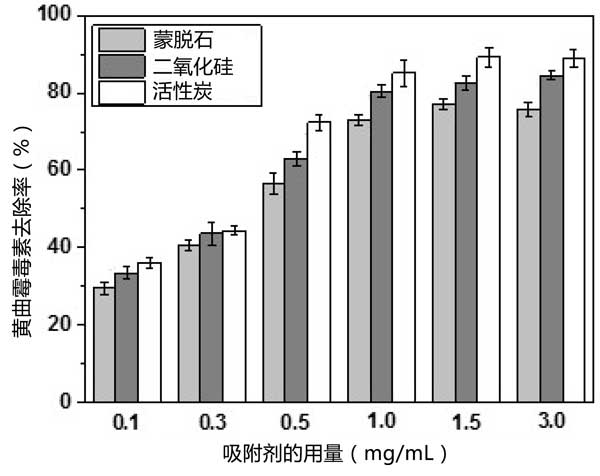 三種吸附劑對AFB1的吸附在25℃下進(jìn)行24小時。圖1顯示了活性炭和其它吸附劑用量的AFB1去除率。無論吸附劑劑量如何,使用活性炭時去除率更高,其次是二氧化硅和天然蒙脫石。正如預(yù)期的那樣,AFB1的去除率隨著吸附劑劑量的增加而增加,這可以通過AFB1與吸附劑之間的相互作用增加來解釋,包括氫鍵、孔填充和靜電吸引力。吸附劑量為1.0mg/mL時,黃曲霉毒素的去除率使用蒙脫石、二氧化硅和活性炭時,分別為73.23%、80.35%和85.09%。在較高的吸附劑量(1.5mg/mL)下,去除率分別略微增加至75.56%、83.48%和89.15%。在這個吸附系統(tǒng)中,當(dāng)吸附劑以較低濃度使用時,可用的吸附位點(diǎn)較少。因此,增加吸附劑濃度有效地增加了吸附位點(diǎn)的數(shù)量,從而提高了AFB1的去除率。但濃度過高時,吸附劑顆粒間會發(fā)生膠結(jié)、絮凝和團(tuán)聚現(xiàn)象。這導(dǎo)致可用吸附位點(diǎn)的數(shù)量穩(wěn)定或減少,并且去除率沒有進(jìn)一步提高。此外,當(dāng)吸收劑以高濃度使用時,可能會消除維生素E和甾醇等微量營養(yǎng)素,從而導(dǎo)致營養(yǎng)流失。因此,使用濃度為1.0mg/mL的吸附劑被認(rèn)為是合適的,因此在進(jìn)一步的實(shí)驗(yàn)中被采用。