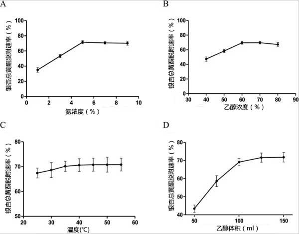 活性炭對銀杏葉中銀杏總黃酮的吸附主要依靠分子間范德華力的可逆吸附和表面酸性氧化物的不可逆吸附,兩者在吸附極性化合物方面均優(yōu)于非極性化合物。銀杏總黃酮的解吸方法主要有升溫解吸(沸水)、置換解吸(苯酚、氨水或CaCl2)和超聲波解吸。沸水對銀杏總黃酮的穩(wěn)定性影響很大,氨水的效果與幾種去污劑相比效果顯著。因此,本研究將通過單因素優(yōu)化相關(guān)因素。單因素優(yōu)化比較了三種拆分劑(苯酚、氨水或CaCl2)對活性炭中銀杏總黃酮拆分的影響,其中氨水的影響最為顯著。因此,我們比較了不同濃度氨對活性炭解析的洗脫速率,氨濃度在5%時(shí)達(dá)到最大值,超過5%后逐漸下降。由于黃酮類化合物的極性范圍較寬,在大約5%的氨-乙醇-水溶液中可以實(shí)現(xiàn)銀杏總黃酮的最大解吸率(71.2%)。