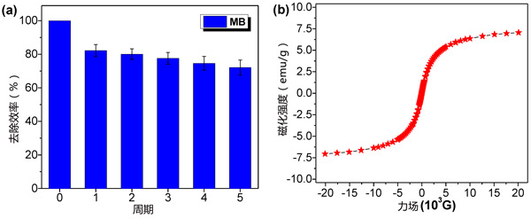 首先,研究了活性炭含量對(duì)磁性吸附劑吸附能力的影響。為了比較,活性炭的吸附容量也在相同條件下確定。在較高的初始染料濃度(5.0mM)下,磁性活性炭對(duì)MB和MO的飽和吸附能力明顯增加,隨著活性炭含量的增加。但是對(duì)于實(shí)際的吸附應(yīng)用,非常需要具有良好可重復(fù)使用性的吸附劑。我們通過(guò)使用乙醇作為洗脫劑來(lái)評(píng)估吸附MB的磁性活性炭的可重復(fù)使用性。如圖3a所示,解吸的磁性活性炭的去除效率隨著重復(fù)使用次數(shù)的增加而降低。與原來(lái)的去除效率相比,經(jīng)過(guò)5個(gè)解吸-吸附循環(huán)后,去除效率保持在72.1%左右。盡管如此,再生的活性炭的吸附能力仍然比較高,高于傳統(tǒng)的磁性吸附劑。此外,即使經(jīng)過(guò)5次再生吸附循環(huán)后,磁性活性炭仍表現(xiàn)出與新制備的相似的飽和磁化強(qiáng)度值(圖3b),表明這次的新型吸附劑具有良好的結(jié)構(gòu)穩(wěn)定性。