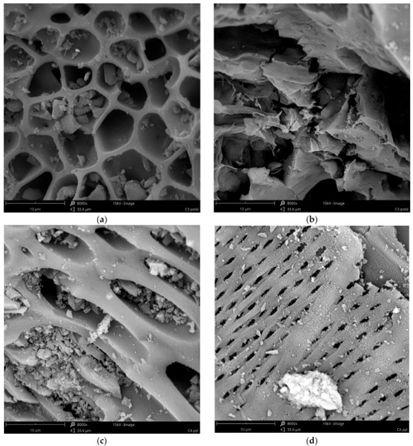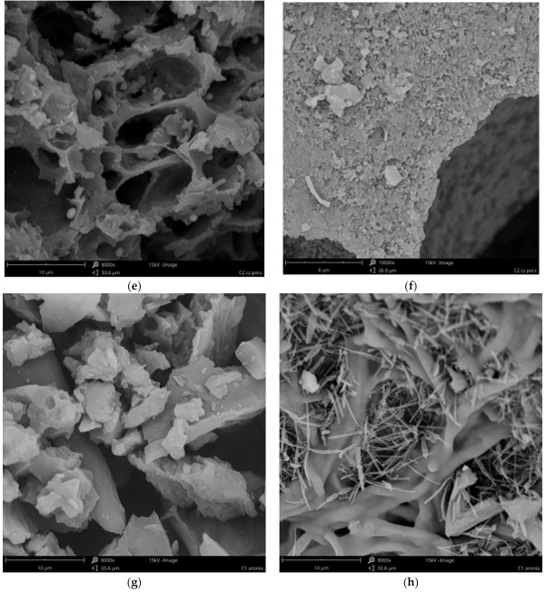 在溶劑加載之前的活性炭通過使用掃描電子顯微鏡作為SEM顯微照片進(jìn)行表征(圖1)。分析表明,不僅研究不同材質(zhì)活性炭彼此的不同,而且在一種材料中也可能出現(xiàn)不同的結(jié)構(gòu)(圖1a與圖1b、圖1c與圖1d、圖1e與圖1f和圖1g與圖1h)。所有的材料都不是均質(zhì)的,在所有的原材料中,都可以發(fā)現(xiàn)具有不同孔隙率的顆粒、壓實(shí)的塊狀,甚至是纖維結(jié)構(gòu)。材料C1(粒徑0.5÷0.75mm的活性炭)是高度多孔的,顆粒充滿可見孔,直徑為5÷11µm,壁光滑(圖1a),顆粒結(jié)構(gòu)的壁密度較低,但也有很大的表面積(圖1b)。粉狀活性炭(C2)具有較小的(圖1d)和較大的(圖1c)孔,具有光滑(圖1c)和較粗糙(圖1d)的壁和細(xì)長(zhǎng)的形狀。這兩種材料似乎都具有良好的孔隙率和表面,因此它們應(yīng)該是非常有效的吸附劑。我們的結(jié)果證實(shí),C1和C2在鉭的去除方面都非常有效,去除效率約為97%。C3的多孔性要小得多。雖然有一些顆粒具有相對(duì)較高的孔隙(圖1e),但也有較高含量的更致密、相當(dāng)無孔的塊狀(圖1f)?紫督Y(jié)構(gòu)受到輕微干擾,可能是由植物材料中可能存在的無機(jī)化合物晶體造成的(圖1e)。因此,這種結(jié)構(gòu)表明較低的表面和吸附特性。然而,無孔件的表面積似乎很發(fā)達(dá)(圖1f)。這是相當(dāng)虛幻的,因?yàn)樵谑褂玫乃谢钚蕴恐校牧螩3的鉭去除效率最低(81%)。最小的大孔材料似乎是C4炭。它由具有緊湊結(jié)構(gòu)的塊(圖1g)和類似于納米管或纖維結(jié)構(gòu)的形式(圖1h)組成。這種材料的多孔性也比C1和C2少,但由于纖維的原因,它的表面應(yīng)該比C3更發(fā)達(dá),因此它應(yīng)該具有更好的吸附效率。事實(shí)上,這種材料的鉭去除效率略高于C3,但仍低于活性炭C1和C2。根據(jù)這些結(jié)果,可以得出結(jié)論,C1和C2的原材料就具有大孔結(jié)構(gòu)。