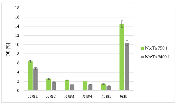 在進(jìn)一步的研究中,檢查了是否可以多次使用相同部分的浸漬活性炭從鉭中提純鈮。為此,以分批模式進(jìn)行解吸研究。使用了兩種不同的剝離劑草酸銨和過氧化氫的溶液(圖3),它們與鉭離子形成穩(wěn)定的絡(luò)合物。解吸過程分五個(gè)步驟進(jìn)行,在使用4%草酸銨溶液而不是15%過氧化氫溶液的情況下,解吸效率明顯更高。使用第一汽提劑,可以回收保留在活性炭上約50%的鉭。大部分鉭在第一步和第二步中回收,因此在第五步停止解吸,認(rèn)識(shí)到繼續(xù)該過程不會(huì)顯著提高所獲得的解吸百分比。解吸效率還受吸附過程中活性炭上保留的鉭量的影響。在批量吸附過程中保留在樹脂上的鉭量的差異是由于使用了具有不同鈮與鉭比率的溶液,同時(shí)保持溶液中Nb和Ta離子的可比總濃度。降低活性炭(Nb:Ta=3400:1)上的鉭量會(huì)導(dǎo)致解吸效率顯著降低,這可能是由于活性炭結(jié)合了一些鉭離子。
