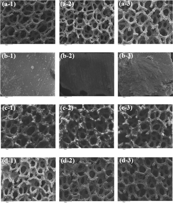 圖1:(a)金屬泡沫催化劑、(b)HZSM-5顆粒催化劑、(c)HZSM-5/金屬泡沫催化劑和(d)活性炭/金屬泡沫催化劑的SEM照片,反應(yīng)前的催化劑(a-1、b-1、c-1、d-1)、450℃反應(yīng)后的催化劑(a-2、b-2、c-2、d-2)、催化劑在550℃反應(yīng)后(a-3,b-3,c-3,d-3)。