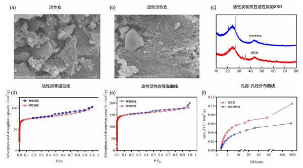 當(dāng)原活性炭經(jīng)受0.1mol/L、0.5mol/L和0.8mol/L高錳酸鹽,煅燒溫度為400℃、500℃、800℃,煅燒時(shí)間為2小時(shí),5小時(shí)和7小時(shí)。通過(guò)三因素三水平正交試驗(yàn)和極差分析篩選出改性活性炭的合適組合。改性后觀察到活性炭表面形態(tài)發(fā)生顯著變化,分別如圖1(b)所示。改性前的活性炭表面有較大的團(tuán)聚顆粒,表面沒(méi)有明顯的孔隙結(jié)構(gòu)。改性后表面粗糙,呈不規(guī)則凸起的刺狀顆粒結(jié)構(gòu),孔隙結(jié)構(gòu)發(fā)達(dá)。改性前后活性炭的XRD圖如圖1(c)所示;钚蕴扛男郧昂蟮姆逍蜗嗨,但一些峰出現(xiàn),另一些峰消失。圖1(d)和1(e)分別顯示了活性炭改性前后的吸附和解吸等溫線(xiàn)。它們整體呈隨P/P0增加的趨勢(shì),吸附量增加,但在相同情況下,改性活性炭的吸附能力更強(qiáng)。圖1(f)為改性前后活性炭的孔容孔徑分布,改性后的活性炭孔體積更大。改性活性炭的比表面積是活性炭的兩倍,累積吸附總孔體積是活性炭的1.72倍。