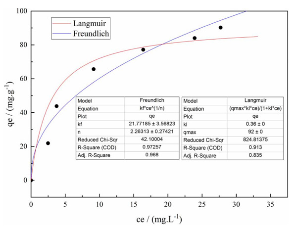 當(dāng)反應(yīng)溫度為25℃,投加量為8g/L時(shí),可獲得不同初始濃度下亞硝基二乙胺的平衡濃度和改性活性炭的平衡吸附容量。使用Langmuir和Freundlich熱力學(xué)方程對(duì)數(shù)據(jù)進(jìn)行擬合,結(jié)果如所示圖3從圖中可以看出,吸附過(guò)程不符合Langmuir等溫線(xiàn)方程,F(xiàn)reundlich吸附等溫線(xiàn)方程也適用。當(dāng)初始濃度達(dá)到一定值時(shí),吸附趨于平衡并達(dá)到飽和。