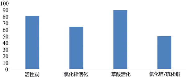 圖2:四種不同活性炭樣品對(duì)高錳酸鉀吸附的去除百分比。