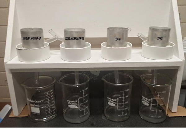 酸二氫鉀在去離子水中制備磷溶液,將活性炭稱重到試管中,,并用36mL的16.3mg/L-1正磷酸鹽平衡,僅包括沙子或浮石樣品。將管在端到端振蕩器上以90min-1的頻率平衡24小時,并通過0.2-μm膜過濾器過濾上清液。根據(jù)鉬酸鹽法,使用UV-VIS分光光度計分析濾液中的正磷酸鹽?偣16根柱子(直徑7.62厘米,高7.62厘米)用沙子或浮石填充到4.56厘米的深度(圖2)。十六列對應(yīng)于由兩種過濾器(沙子或浮石)和四種活性炭改進材料組成的實驗,包括對照(無添加活性炭),一式兩份。將含活性炭改良劑和不含活性炭改良劑(按重量計5%)的沙子或浮石混合,然后將其干填充到柱中。每個柱子的底部都用粗棉布保護,這樣可以大限度地減少過濾材料的損失。