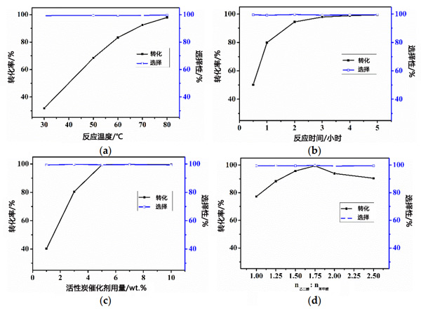 以苯甲醛與乙二醇的縮合反應(yīng)為探針反應(yīng),研究了活性炭在縮醛和縮酮合成中的催化性能。一般程序如下:10mL溶劑環(huán)己烷、25mmol苯甲醛,將43.75mmol乙二醇和0.13g活性炭催化劑在配備有溫度計(jì)和回流冷凝器的三頸燒瓶中混合,并在80℃下反應(yīng)5小時(shí)。測(cè)試了反應(yīng)溫度、反應(yīng)時(shí)間、催化劑用量和乙二醇/苯甲醛摩爾比對(duì)苯甲醛轉(zhuǎn)化率的影響。同時(shí),測(cè)試了活性炭在苯甲醛與乙二醇縮合反應(yīng)中的催化回收性能,并討論了不同基材的適用性。