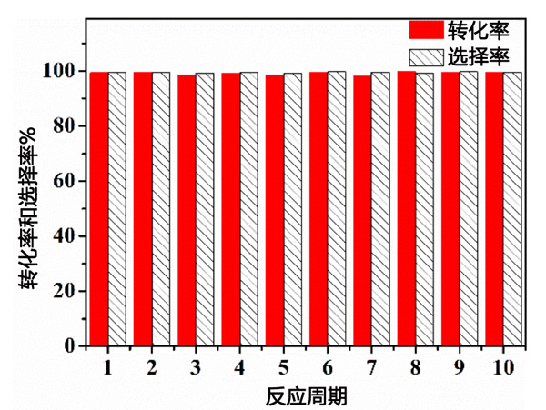 最后通過回收實(shí)驗(yàn)測(cè)試了活性炭催化劑的穩(wěn)定性,測(cè)試結(jié)果如圖3所示。在催化劑可重復(fù)使用性能的探索中,活性炭催化劑用溶劑環(huán)己烷洗滌,然后進(jìn)入下一個(gè)反應(yīng)循環(huán)。具體過程為將反應(yīng)完成后的固體離心分離出來,再用環(huán)己烷洗滌固體3次,以完全去除前一輪反應(yīng)表面殘留的少量液體。即使在連續(xù)運(yùn)行10次后,催化劑的性能也沒有顯著降低,仍然達(dá)到99%的苯甲醛轉(zhuǎn)化率和99%的選擇性。因此,活性炭催化劑是用于研究苯甲醛乙二醇縮醛反應(yīng)的優(yōu)異且穩(wěn)定的可回收固體酸催化劑。