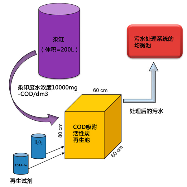 根據(jù)獲得的數(shù)據(jù)和當(dāng)前的紗線染色工藝,使用所提出的兩步處理系統(tǒng)處理來自常用的200L染浴的高COD染色廢水看起來適用,并提出了建議如圖3所示。據(jù)我們所知,目前運(yùn)營的染色設(shè)施中沒有這種建議的設(shè)置。設(shè)計(jì)容積(即200L)足以容納一批染缸出水,使高COD廢水可直接進(jìn)入擬建裝置的吸附和再生。根據(jù)結(jié)果,去除50-60%的COD將大大減少回流到平衡罐的COD,從而避免現(xiàn)有廠內(nèi)生物處理單元的過載情況。為了運(yùn)行所提議的裝置,首先,將來自染色池的一定量的高COD廢水引導(dǎo)至充滿指定活性炭的反應(yīng)單元(如果處理120L廢水,則為20kg)進(jìn)行24小時吸附。由于結(jié)果表明染浴出水COD在酸性pH值下吸附更多,二是對處理后的廢水進(jìn)行篩分,24小時后排至其廢水處理設(shè)施的頭部(即平衡池)。第三,分別串聯(lián)添加初始濃度為2.12mmol/dm3和2.5%的乙二胺四乙酸鐵鈉和過氧化氫,以啟動活性炭再生1小時。從連續(xù)運(yùn)行來看,兩步法處理高COD染色廢水的應(yīng)用前景看好。然而,我們確實(shí)注意到該技術(shù)的當(dāng)前應(yīng)用可能僅限于染浴設(shè)計(jì)及其操作。染浴的高COD流出物發(fā)生在染色過程的第一次排放,但對于大多數(shù)可用的染浴操作,根據(jù)不同的COD濃度對每批流出物進(jìn)行分離是不適用的。一些染色裝置或染色工藝的改造被認(rèn)為是必要的。