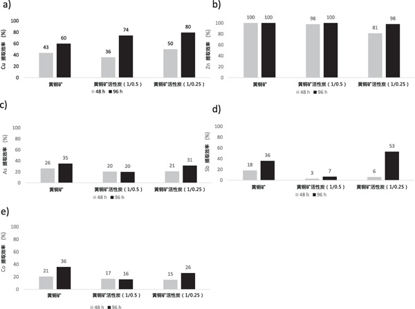 使用帶有攪拌的恒溫浴用于浸出測(cè)試,該測(cè)試在90℃和250rpm下在250mL硼硅酸鹽玻璃罐中使用H2SO4溶液(在pH值1)濃度為5gL-1的Fe(III)。在浸出過程中控制溫度(90℃)和攪拌速度(250rpm),直到48和96小時(shí)。浸出劑溶液的Eh為547mV。硫酸的純度和硫酸鐵(III)分別為97%和99.5%。在每個(gè)實(shí)驗(yàn)中,在硼硅酸鹽玻璃罐中稱量2.5g。除對(duì)照外,活性炭比為1/0.5和1/0.25。然后,加入50mL浸出劑。使用兩個(gè)反應(yīng)時(shí)間對(duì)每種活性炭混合物進(jìn)行兩次浸出實(shí)驗(yàn):第一次直到48小時(shí),第二次直到96小時(shí)。在浸出實(shí)驗(yàn)期間,每24小時(shí)打開一次罐子,以確保浸出系統(tǒng)有足夠的氧合。在反應(yīng)結(jié)束時(shí)(48小時(shí)和96小時(shí)),將紙漿過濾并用50mL/H2SO4洗滌兩次pH2的溶液以回收吸附在活性炭表面上的金屬。通過測(cè)定浸出和洗滌溶液中的Cu、Zn、As、Co和Sb的含量。
