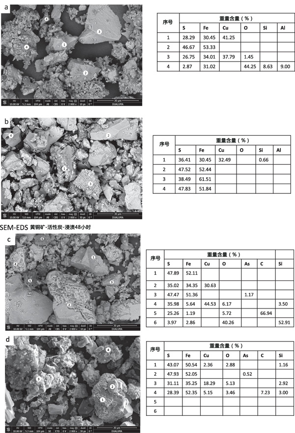 在浸出殘?jiān)邪l(fā)現(xiàn)的其他礦物種類是黃銅礦、黃鐵礦、閃鋅礦和石英。氧化還原電位必須足夠低才能形成Cu2S,而黃鉀鐵礬沉淀在非常高的氧化還原電位下更受青睞。通過SEM-EDS對(duì)初始活性炭樣品(圖3a)和浸出殘留物(圖3b和3c)的分析表明存在黃銅礦、黃鐵礦和初始精礦中的小石英顆粒。浸出48小時(shí)后(圖3b),固體殘留物顯示存在黃銅礦,表面因浸出而改變黃鐵礦。對(duì)活性炭浸出48小時(shí)后獲得的殘留物的分析表明存在黃鐵礦、吸附硫的碳,并且一些黃銅礦顆粒發(fā)生了很大的變化,表明從黃銅礦中優(yōu)先浸出Fe而不是Cu。