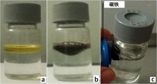 圖1:活性炭的選擇性和浮力的定量說明:(a)機油/水混合物,(b)將活性炭添加到機油/水混合物后30秒,(c)借助磁棒去除油吸附的活性炭磁性粒子。