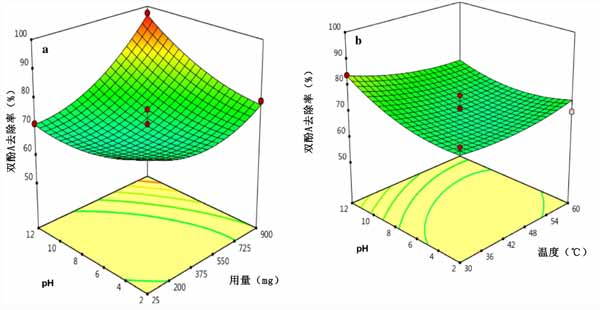 圖2:活性炭上雙酚A去除效率的響應(yīng)面3-D圖顯示了(a)初始濃度和劑量以及(b)pH和溫度的影響。
