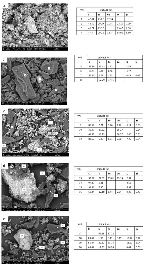 圖2:浸出96小時(shí)后獲得的最終殘留物的SEM-EDS圖像(a)黃銅礦礦石,(b)礦物:活性炭1:1,(c)礦物:活性炭1:0.25,(d)礦物:生物炭1:1,(e)礦物:生物炭1:0.25。