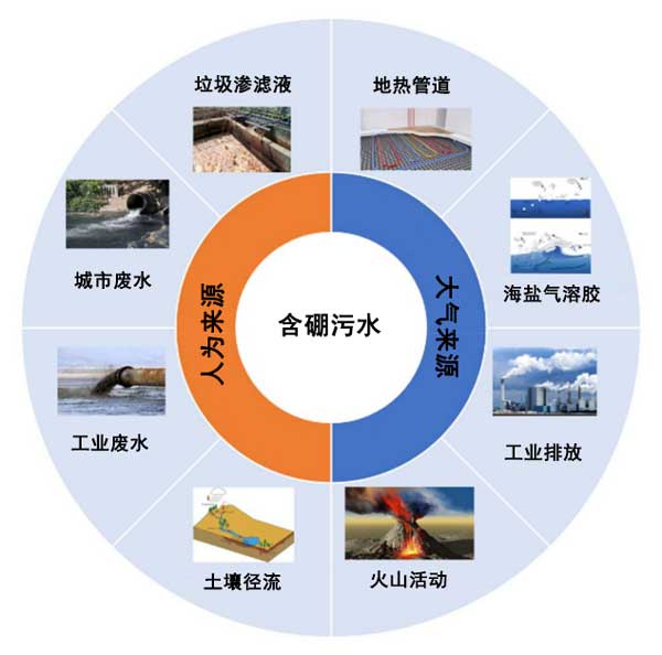 硼通過礦物提取、煤炭燃燒、含硼砂產(chǎn)生的清潔劑的廢水排放、硼肥等應(yīng)用以及硼化物處理的木材的副燃燒進入水環(huán)境(圖1)。由于人類活動的影響,已經(jīng)觀察到地下水和地表水中的硼濃度增加。硼在水生環(huán)境中的存在會對環(huán)境造成很大的影響。但從工業(yè)設(shè)施對硼的需求增加,水資源中硼的含量增加,水質(zhì)標準變得更加嚴格。所以需要去除水中的硼來修復(fù)環(huán)境。脫硼方法包括膜分離、活性炭吸附、(電)凝聚和沉淀、萃取以及這些方法的組合。