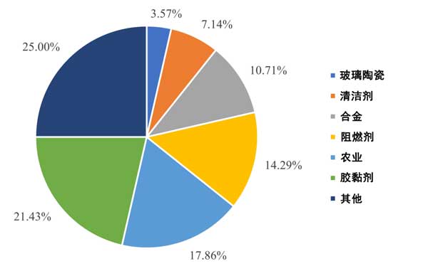 硼是自然界七大必需微量元素之一,少量的硼攝入有利于植物細胞膜保持其結(jié)構(gòu)和功能的完整性,并維持正常的發(fā)育和物質(zhì)運輸。硼不僅是生物體必需的微量元素,也是許多工業(yè)的重要原料,如制造業(yè)和農(nóng)業(yè)。根據(jù)近期的統(tǒng)計數(shù)據(jù),僅硼酸鹽就有300多種應(yīng)用,全球四分之三以上的硼消耗量來自陶瓷、洗滌劑、化肥和玻璃(圖2)。在生產(chǎn)過程中,硼酸鹽是制造各種特殊玻璃和陶瓷的主要成分。在高級玻璃和玻璃纖維的生產(chǎn)中使用硼硅酸鹽可以提高玻璃的耐熱性和透明度,有利于提高其化學(xué)穩(wěn)定性以及抗機械和熱沖擊的能力。在瓷釉中加入硼可以防止脫釉和開裂,提高產(chǎn)品的光澤度和耐久性。在瓷體中加入硼酸鹽有利于降低能耗,提高產(chǎn)品的機械強度。硼還用于生產(chǎn)微合金鍛鋼并提高鋼的沖擊強度。在農(nóng)業(yè)領(lǐng)域,硼被用于生產(chǎn)含硼化肥等產(chǎn)品。但是灌溉水中的硼含量升高會直接導(dǎo)致動植物中毒造成危害,所以一定要控制排放。
