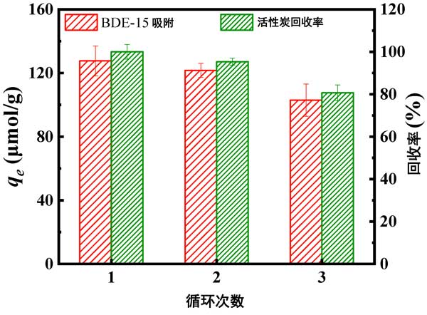 為研究活性炭處理洗脫液后的循環(huán)利用性能,采用甲醇洗脫活性炭進行再生回用。如圖3所示,在三個回收-吸附循環(huán)中,活性炭的吸附量略有下降,活性炭的吸附量保持在103μmol/g以上,下降了25μmol/g(下降了19%);钚蕴勘憩F(xiàn)出良好的可回收性和可重復使用性,有利于實際應用。