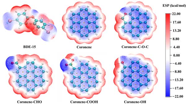 為進一步研究PBDEs與活性炭之間的微觀相互作用機制,通過計算化學研究了活性炭結構模型與BDE-15之間的弱相互作用。根據(jù)表征結果,構建了以暈苯為基本結構的純碳結構模型,以及羧基、羥基、醛和醚取代的結構模型,模擬了活性炭的不飽和碳結構和含氧官能團結構。BDE-15和五種活性炭結構模型的靜電勢如圖5所示。BDE-15在其溴原子和氧原子附近顯示出負靜電勢,而在其他區(qū)域,尤其是在其氫原子附近,則顯示出正靜電勢。這是因為溴原子和氧原子的電負性大于碳原子,而氫原子的電負性最小。在Coronene的結構中,所有的碳原子都表現(xiàn)出負的靜電勢特征,而氫原子則表現(xiàn)出正的靜電勢特征。含氧官能團的引入增加了基團附近的正靜電勢面積和負靜電勢面積,屬于結構中極性最強的區(qū)域。根據(jù)正負靜電勢相互吸引的原理,BDE-15和活性炭結構模型可以形成多種復合構型?梢酝茰y,基團附近存在強靜電勢區(qū)使得BDE-15更容易與基團結合。