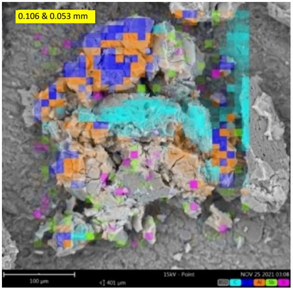 水性介質(zhì)最終溶液中的元素通過測定。溶液中存在的元素可以來自電極氧化、活性炭孔隙中的元素提取以及水介質(zhì)中使用的硬水中的元素。在測試中,由于電凝過程中的廣泛氧化,F(xiàn)e水平低于Fe量化限值(0.01mg/L)。使用0.106毫米大小的活性炭顆粒的電凝工藝在鋁電極上實(shí)現(xiàn)了比鐵電極更均勻的涂層,如750倍和600倍放大率下的活性炭顆粒的SEM圖像所示(見圖1);钚蕴拷Y(jié)果中存在的多元素在王水中消解并通過ICP-OES表征,通過電極的氧化、活性炭顆粒的凝聚和水介質(zhì)硬水中所含金屬的吸附而增加。