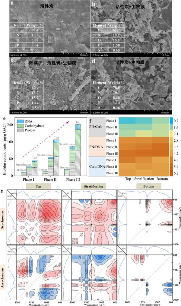 活性炭是生物膜生長的優(yōu)良載體,它可以快速從液相中吸收有機(jī)物和營養(yǎng)物質(zhì),用于生物膜中微生物的新陳代謝。圖1顯示了有和沒有生物膜的活性炭形態(tài)動(dòng)力學(xué)、生物膜組分的濃度和反應(yīng)器不同位置的官能團(tuán);钚蕴恐械脑刂饕ㄌ(C,88.4%)、氮(N,4.87%)、氧(O,5.68%),以及少量的磷(P,0.04%),活性炭表面為比較順利。生物膜形成后,活性炭表面附著大量生物質(zhì),變得更加粗糙。由于生物膜中蛋白質(zhì)、碳水化合物和DNA的積累,包括N、O和P在內(nèi)的主要元素的比例顯著增加(圖1e)。值得注意的是,硫元素也被檢測(cè)到,這應(yīng)該有助于活性炭和生物膜對(duì)LAS(磺酸基團(tuán))的吸附。