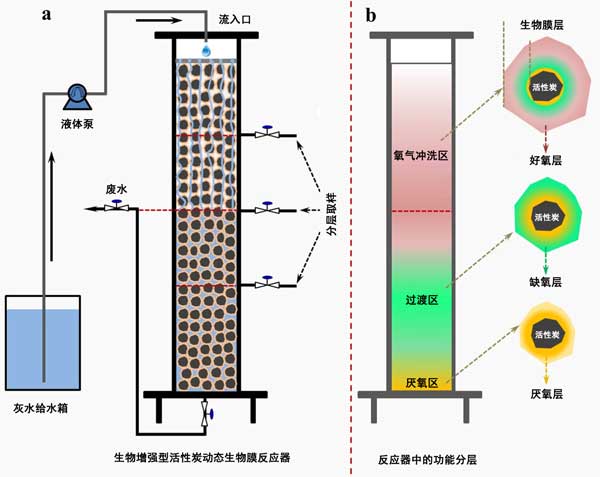 圖2:a活性炭動(dòng)態(tài)生物膜反應(yīng)器示意圖和b灰水期間活性炭反應(yīng)器中的功能區(qū)和生物膜層在顯著分層位置處理。