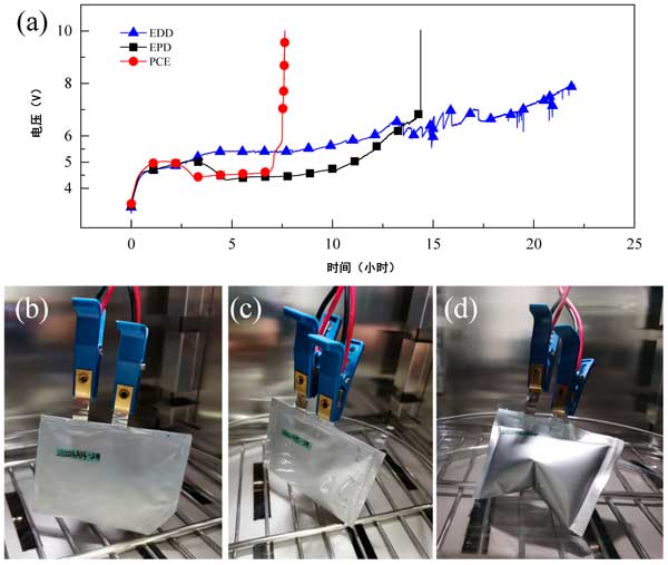 圖2:過(guò)充至10.0V的活性炭鋰半電池:(a)電壓隨時(shí)間變化曲線,以及使用不同電解質(zhì)過(guò)充過(guò)程后半電池的照片:(b)EPD,(c)PCE和(d)EDD。