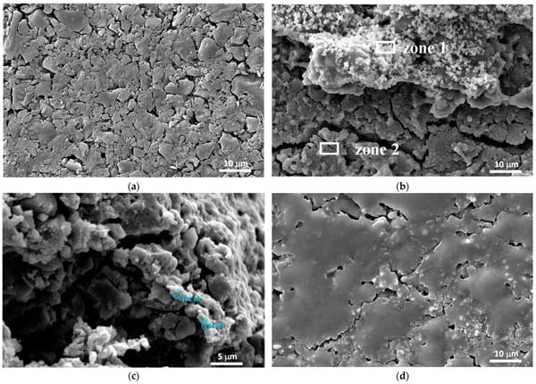 圖3:(a)交流電極和來(lái)自活性炭鋰半電池的交流電極的SEM圖像充電到10.0V的高電壓,具有不同的電解質(zhì)(b、c)PCE,(d)EPD。