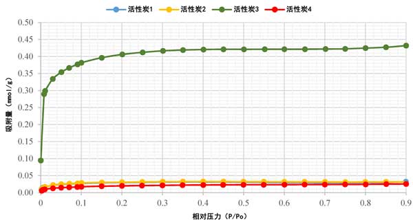 活性炭的吸附等溫線已使用氮(N2)吸附分析技術(shù)(一種標(biāo)準(zhǔn)方法)進行了研究。圖2顯示了活性炭在77K時的N2吸附等溫線,該等溫線被發(fā)現(xiàn)為I型等溫線。N2吸附在低相對壓力范圍內(nèi)的快速上升證實了所有樣品都存在小孢子,如圖2所示。很明顯,活性炭4具有最低的N2吸附,而活性炭1和活性炭2的吸附等溫線重疊,活性炭3具有最高的N2吸附。數(shù)據(jù)的這種可變性可能歸因于所使用的不同前體材料。此外,除活性炭3外,活性炭的大部分孔隙體積都填充在P/Po≈0.1以下。對于活性炭3,孔體積填充低于P/Po≈0.3。在初始增加到0.1后,等溫線逐漸彎曲,表明進一步吸附的增量較小。隨著相對壓力的增加,所有樣品的吸附幾乎呈水平狀態(tài),表明已經(jīng)達到飽和。