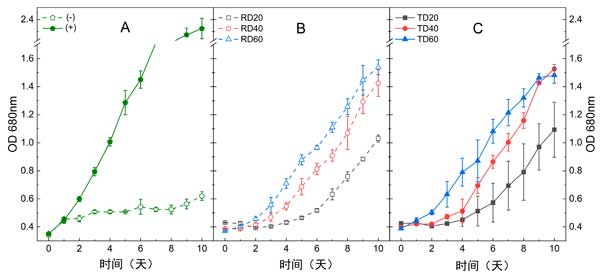 厭氧消化物中存在的大量和微量營(yíng)養(yǎng)素的多樣性可能有利于藍(lán)藻代謝。即使活性炭預(yù)處理顯著降低了幾個(gè)參數(shù),包括COD、濁度和苯酚含量,原料(4405mg/L)和預(yù)處理消化物(4220mg/L)的銨濃度仍然高于藍(lán)藻螺旋藻支持的閾值濃度(100–150毫克/升)。在這種情況下,使用以三種不同稀釋率稀釋的原始和預(yù)處理消化物進(jìn)行了一系列藍(lán)藻毒性測(cè)定:20×、40×和60×。未稀釋的消化物,無(wú)論是否用活性炭處理,都沒有在本實(shí)驗(yàn)中進(jìn)行測(cè)試,因?yàn)槌醪脚囵B(yǎng)分析表明它們對(duì)培養(yǎng)物毒性太大(數(shù)據(jù)未顯示)。因此,該實(shí)驗(yàn)的目的是比較以不同稀釋率稀釋的兩種消化物以及兩個(gè)對(duì)照組之間的生長(zhǎng)性能。連續(xù)測(cè)量680nm處的OD超過10天,以評(píng)估所有條件下的生長(zhǎng)情況。在三種不同稀釋因子下測(cè)試的原始消化物(RD)和處理過的消化物(TD)條件下,觀察到類似生長(zhǎng)趨勢(shì)(圖2A、B)。當(dāng)增加原始和預(yù)處理消化物的培養(yǎng)基稀釋倍數(shù)時(shí),會(huì)產(chǎn)生更高的生長(zhǎng)反應(yīng)。同樣,滯后期受原始消化物和預(yù)處理消化物的稀釋因子的影響,觀察到的滯后期越長(zhǎng),消化物越濃縮。例如,稀釋20倍和40倍的未處理消化物的滯后期分別持續(xù)4天和2天。在本研究中,根據(jù)稀釋倍數(shù)和預(yù)處理?xiàng)l件,使用221和71mg/L之間的初始銨氮(NH4+-N)濃度,鈍頂藻能夠增殖。一般而言,原始消化物和預(yù)處理消化物的更高稀釋度產(chǎn)生更高的生長(zhǎng)。