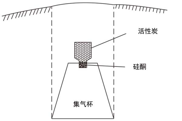 所用儀器為活性炭氡檢測儀。在現(xiàn)場調(diào)查中,將使用過的活性炭烘烤干燥。冷卻后,將活性炭按照適當(dāng)?shù)臉?biāo)準(zhǔn)放入取樣器中,用硅膠塞規(guī)避地下水分的影響,然后將樣品密封備用。接下來,將裝滿的采樣器口朝下放置在測試坑中,如圖1所示。采樣器和集氣杯穩(wěn)定固定,上面蓋上塑料布,密封坑口。當(dāng)埋杯到預(yù)設(shè)時間(至少5天)時,取出采樣器,仔細(xì)填寫采樣時間和氣候。然后將采樣器放入經(jīng)過測試和校準(zhǔn)的活性炭氡氣檢測儀中,記錄每個采樣器的線數(shù)和點數(shù)。