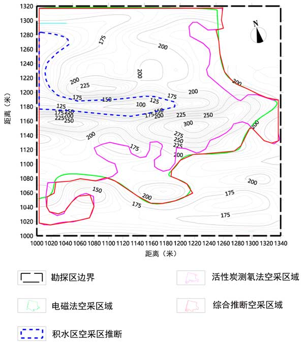 本次調(diào)查工作將電磁法與活性炭測氡法相結(jié)合,形成綜合物探方法,對某礦區(qū)地下采空區(qū)情況進(jìn)行了研究。首先,電磁法用于探測采空區(qū)的深度探測。發(fā)現(xiàn)1個低阻異常帶和1個高阻異常帶,推測后者為采空區(qū)異常帶,前者由采空區(qū)積水或大鵬地層水富集形成,推測為采空區(qū)積水異常帶。然后使用用于測氡的活性炭方法來推斷地下采空區(qū)的位置和范圍。結(jié)合電磁法勘探成果,推測該采空區(qū)為氡值異常帶。