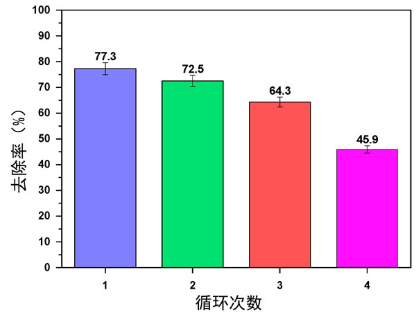 通過回收研究調(diào)查了改性活性炭的再利用以從廢水中去除活性黑5。進(jìn)行實(shí)驗(yàn)時,最初使用100mg/L活性黑5和0.8g/L的改性活性炭,pH值為2。在第一個循環(huán)之后,使用0.01M/NaOH溶液對所使用的改性活性炭顆粒進(jìn)行處理大約2小時。此后,用蒸餾水沖洗顆粒以除去任何殘留的堿。選擇被認(rèn)為可接受的重復(fù)時間,以便能夠在后續(xù)循環(huán)中重復(fù)使用吸附劑。研究結(jié)果如圖3所示。在用1M/NaOH處理成功再生后,解吸的改性活性炭能夠重復(fù)使用多達(dá)四個循環(huán)以去除活性黑5。活性黑5的去除百分比在第一個循環(huán)中約為77.3%,在第四個循環(huán)后下降至約45.9%?偟膩碚f,這項(xiàng)研究證明了將改性活性炭吸附劑重復(fù)使用四個循環(huán)以從廢水中去除活性黑5的潛力。