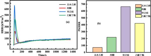 圖4b顯示了四個(gè)樣品的最大放熱率(PkHRR),其順序?yàn)榄h(huán)己烷(663.41kW/m2)>乙酸丁酯(421.4kW/m2)>丙酮(219.49kW/m2)>純無水乙醇(71.4kW/m2)。觀察到3個(gè)VOCs吸附樣品的PkHRR遠(yuǎn)高于ROW,其中環(huán)己烷樣品的Pk放熱率最高,表明CYH樣品的燃燒危害最嚴(yán)重。