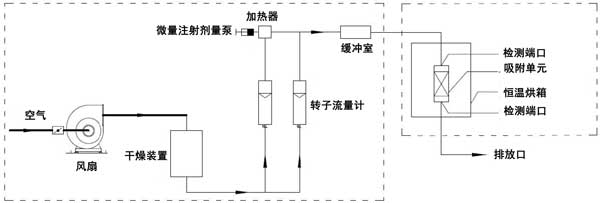 動態(tài)吸附實驗在室溫(25℃)下進行。實驗裝置由氣體分配系統(tǒng)和吸附系統(tǒng)兩部分組成。吸附系統(tǒng)由恒溫箱和吸附單元組成。檢測口位于吸附系統(tǒng)之前和之后。動態(tài)法測定活性炭對脈沖負荷緩沖性能的裝置如圖1所示。本實驗以乙醇或二甲苯為單一檢測對象。氣體分配系統(tǒng)包括風扇、干燥裝置、轉(zhuǎn)子流量計、微注射計量泵、加熱器和緩沖室。使用FT-IR傅里葉氣體分析儀作為測量設備。在氣體分配系統(tǒng)中,在短時間內(nèi)(2分鐘和5分鐘),微注射計量泵的注射量迅速增加到原始體積的預定倍數(shù)(10倍和20倍),以產(chǎn)生脈沖負載。在吸附系統(tǒng)中,吸附單元內(nèi)放置活性炭。吸附單元的直徑為31mm;钚蕴康奶畛涓叨确謩e為2cm、4cm、6cm、8cm。將吸附裝置置于恒溫箱內(nèi)。吸附劑和吸附物的入口空氣保持在室溫。進行了吸附劑在室溫下吸附吸附質(zhì)的脈沖加載實驗。潔凈空氣通過干燥裝置后,利用轉(zhuǎn)子流量計將其按特定比例分成兩個通道。通過微注射泵將特定濃度的乙醇或二甲苯氣體注射到氣體中。另一種氣體用作稀釋氣體。兩種氣體流入緩沖室,完全混合后進入恒溫箱。穩(wěn)定的氣體按照實驗設定的濃度、流量和溫度進入吸附單元。在通過吸附單元之前和之后測量乙醇或二甲苯的濃度。