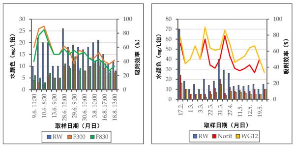 圖2:原水中和處理后的水中腐殖質(zhì)的濃度以及吸附材料的效率。